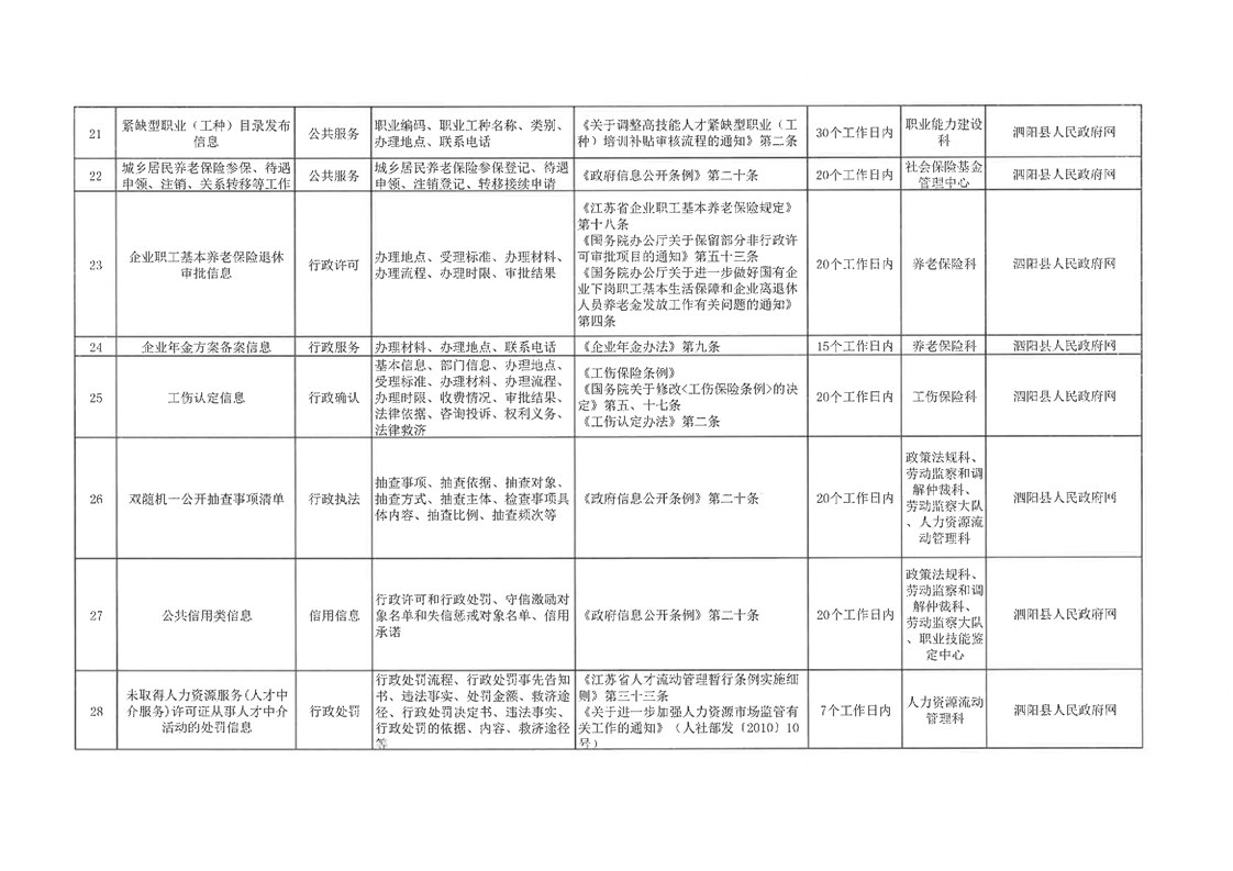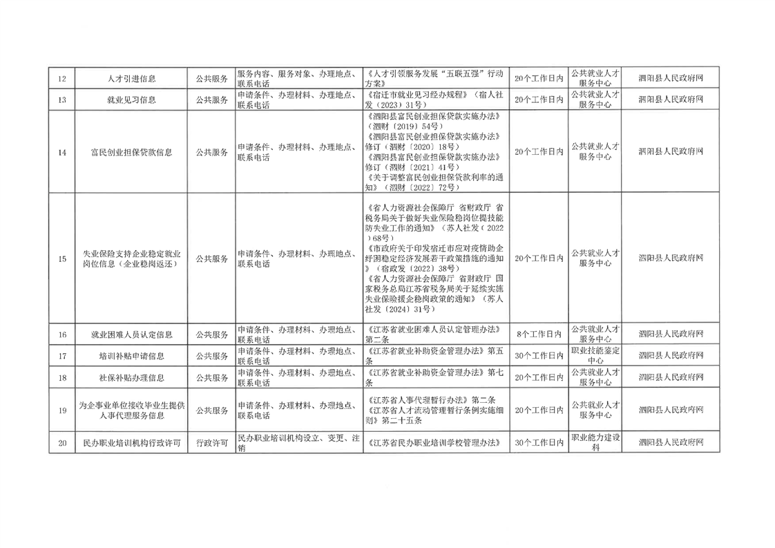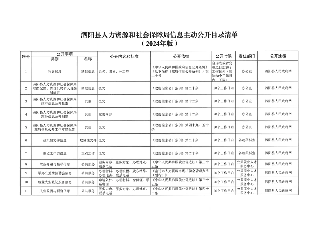 泗陽縣人力資源和社會保障局信息主動公開目錄清單(2024年)