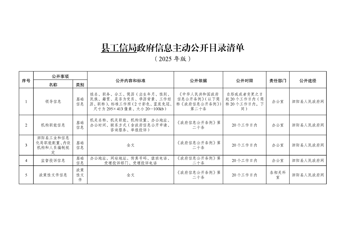 泗陽縣工信局政府信息主動公開目錄清單(2025年版)