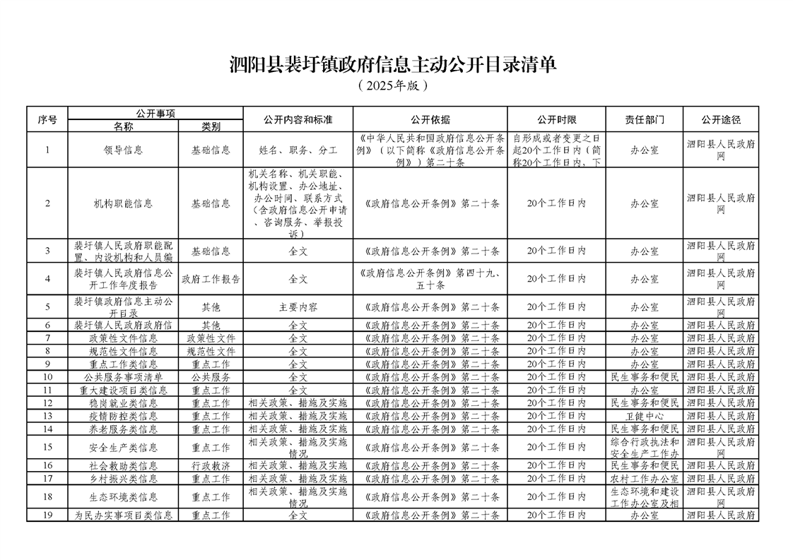 泗陽縣裴圩鎮政府信息主動公開目錄清單(2025年版)