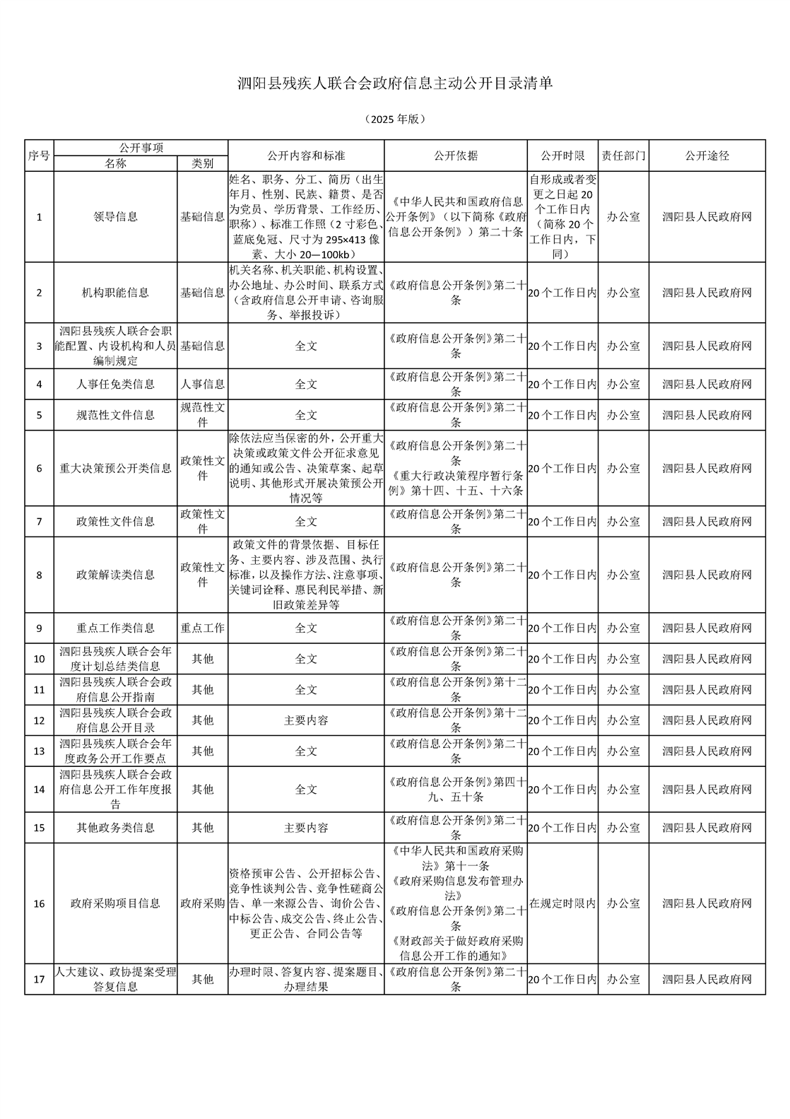 泗陽縣殘疾人聯合會政府信息主動公開目錄清單(2025年版)