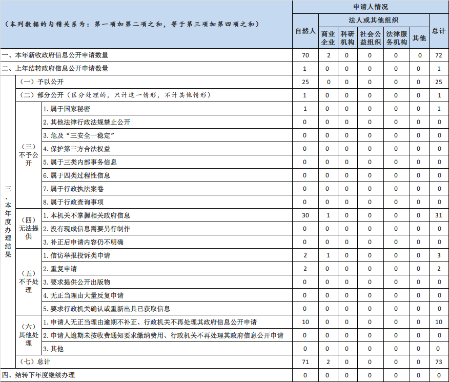 嚴格執行《條例》相關要求,準確運用《泗陽縣政府信息依申請公開制度》,嚴格落實政府信息公開申請登記、審核、辦理、答復、歸檔等工作要求,全年共受理政府信息公開申請72件,承轉上年度辦理1件,其中予以公開的25件,部分公開的1件,屬于國家秘密的1件,本機關不掌握信息的31件,信訪舉報投訴類申請3件,重復申請2件,申請人無正當理由逾期不補正、行政機關不再處理其政府信息公開申請10件,均在法定時限內進行答復,辦結率100%。