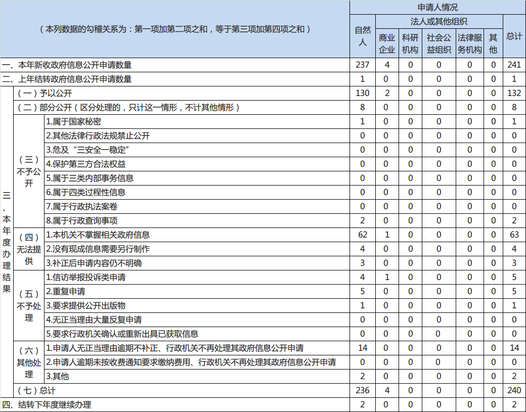 (二)堅持依法依規,進一步規范依申請案件辦理。嚴格執行《條例》相關要求,準確運用《泗陽縣政府信息依申請公開制度》,嚴謹細致辦理政府信息公開申請,做到件件有落實、事事有回應。2022年,泗陽縣共收到政府信息公開申請241件,同比增長32.4%,承轉上年度辦理1件,結轉下一年度繼續辦理2件。其中予以公開132件;部分公開8件;不予公開3件;無法提供70件;不予處理11件;其他處理16件,均在法定時限內進行答復。