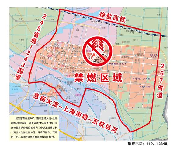 第五條 城區(qū)東至省道267,南至意楊大道—上海南路—京杭運河,西至國道343—省道245,北至徐鹽高鐵合圍的區(qū)域內(nèi)(含以上道路、鐵路、橋、河流)為禁止燃放區(qū),除農(nóng)歷除夕、正月初一外,其他時間全天禁止燃放煙花爆竹。