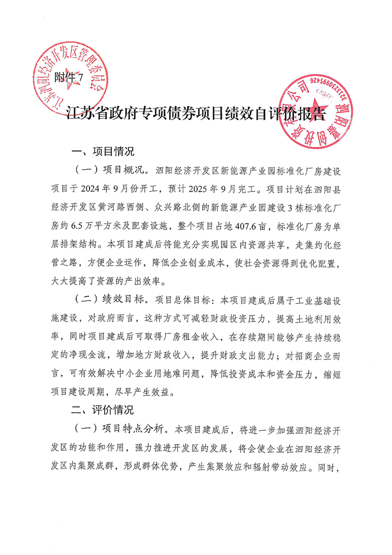 泗陽經濟開發區新能源產業園標準化廠房項目資金績效年度自我評價