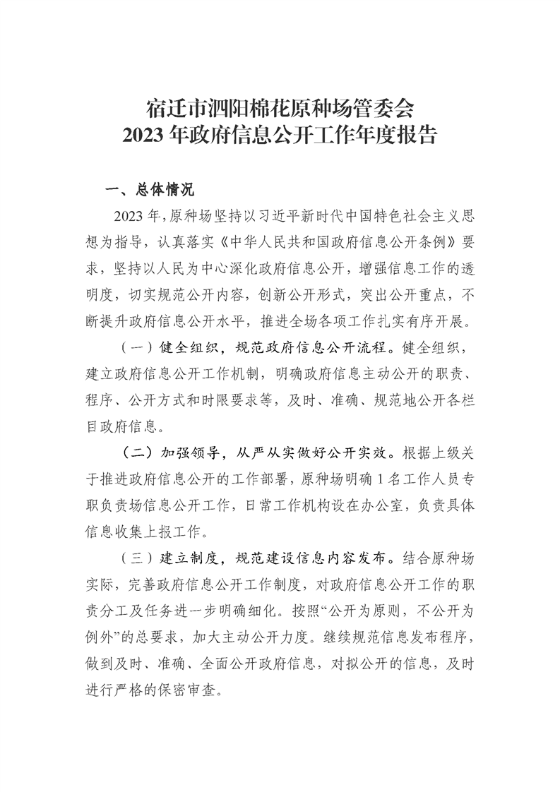 宿遷市泗陽棉花原種場管委會2023年政府信息公開工作年度報告